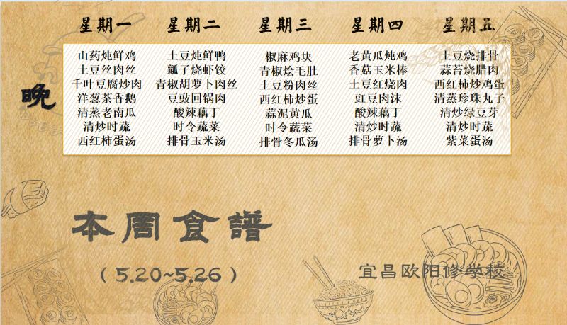 宜昌歐陽(yáng)修學(xué)校每周食譜(5月20日至5月26日)