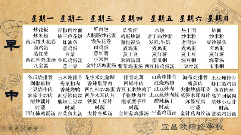 宜昌歐陽(yáng)修學(xué)校每周食譜(10月21日至10月27日)
